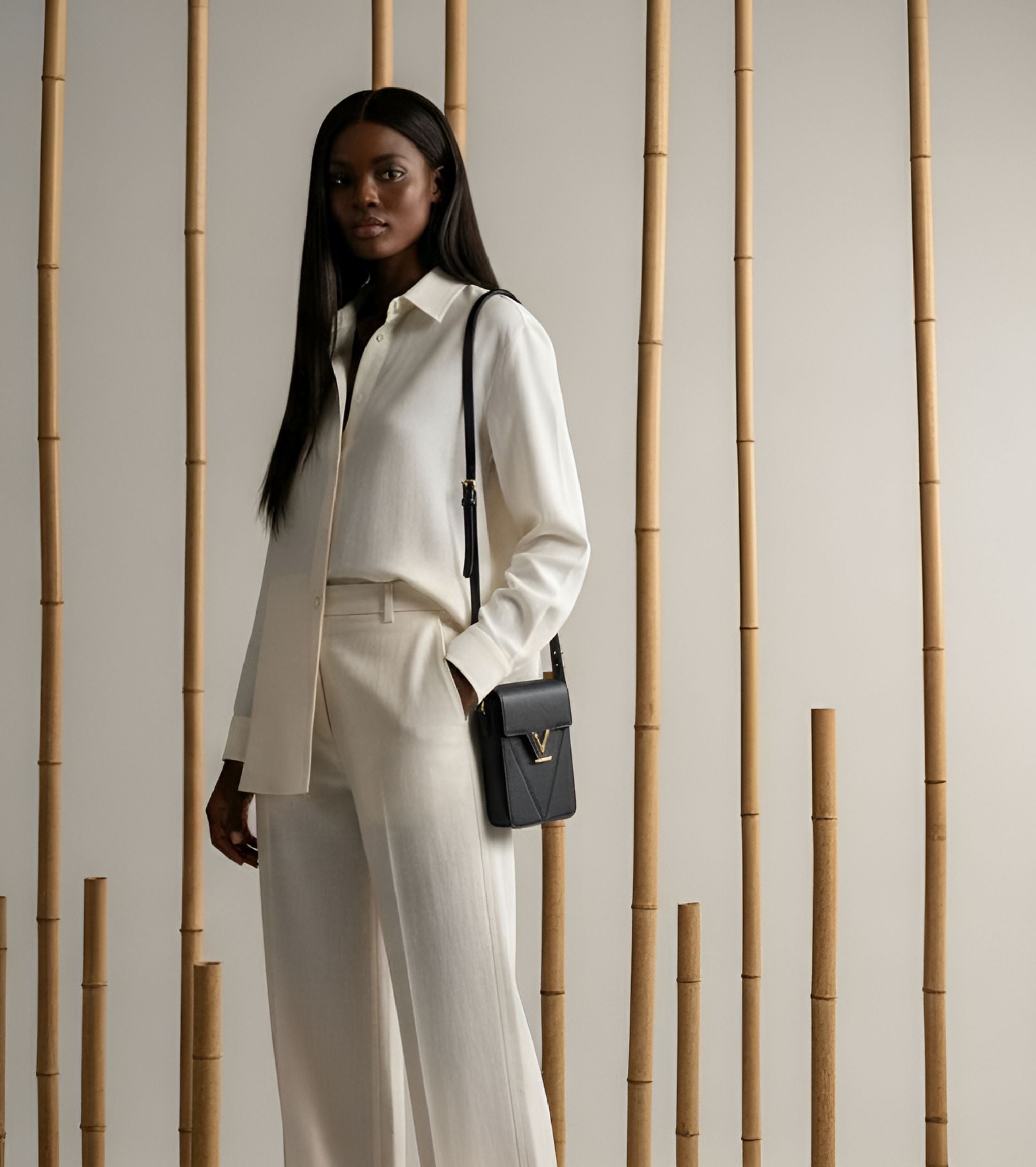 Designed with versatility and practicality in mind, this sleek bag features an internal compartment perfectly sized for your phone, a key slip, and three credit card holder slips to keep your essentials organised. The brushed gold metal V magnetic closure adds a striking detail, while the adjustable strap ensures comfort and style wherever the day takes you.